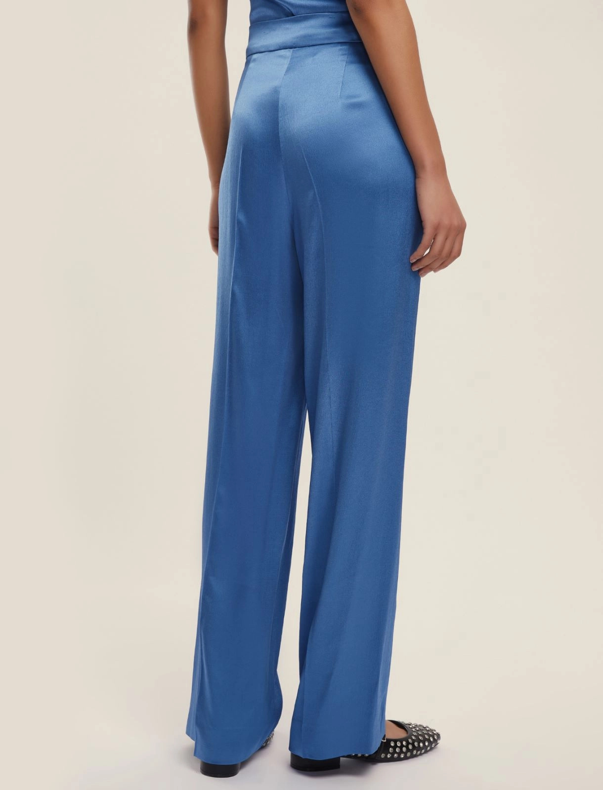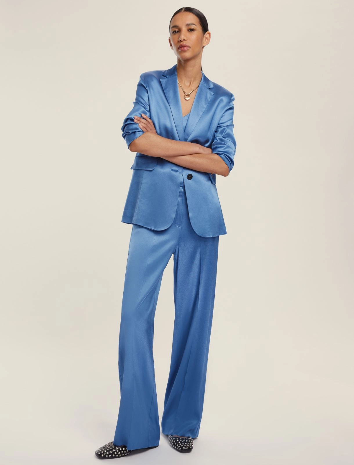Pantalón de raso de viscosa elástica. Corte recto y cierre con gancho masculino y cremallera ocultos. Bolsillos franceses laterales. Raya marcada en la parte delantera y trasera
