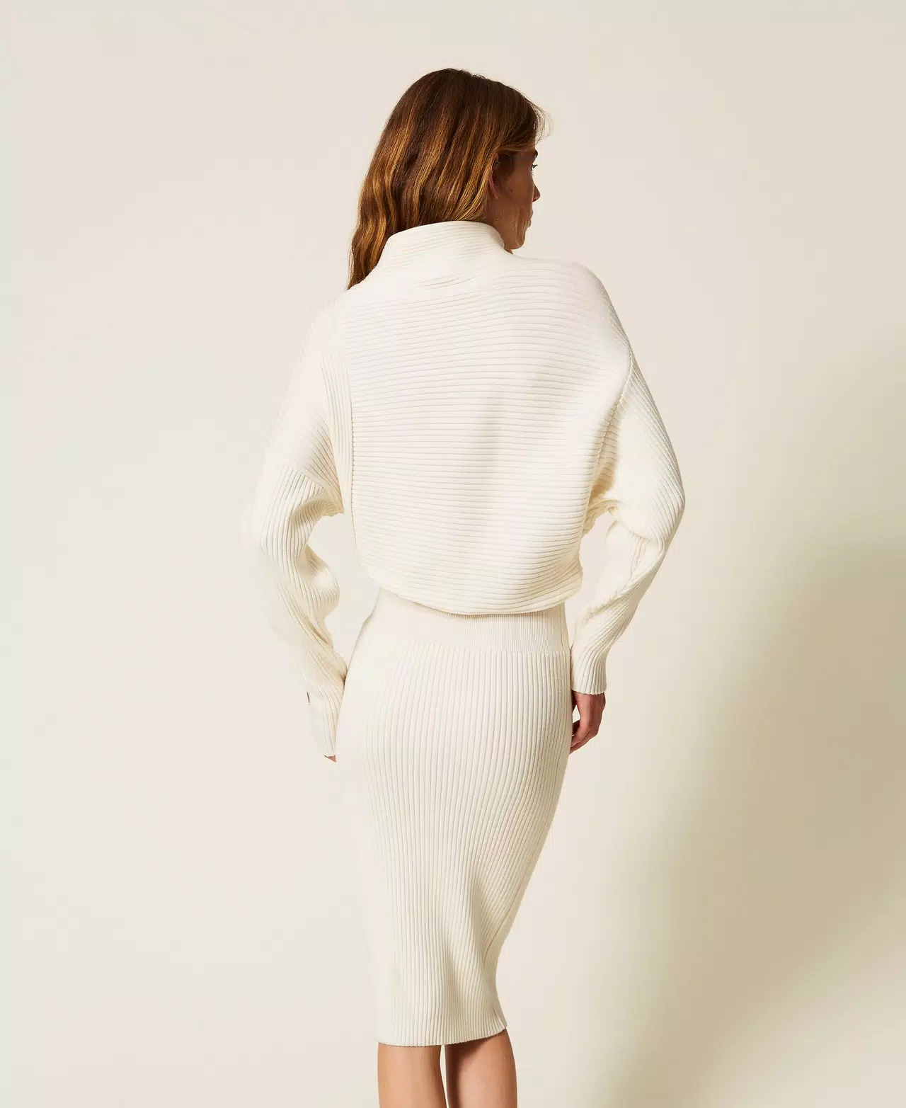 Vestido midi de punto de mezcla de lana acanalada con elaboración lateral en contraste. Presenta un cuello alto suave, manga larga, placa con logotipo de metal y corte holgado con falda recta.