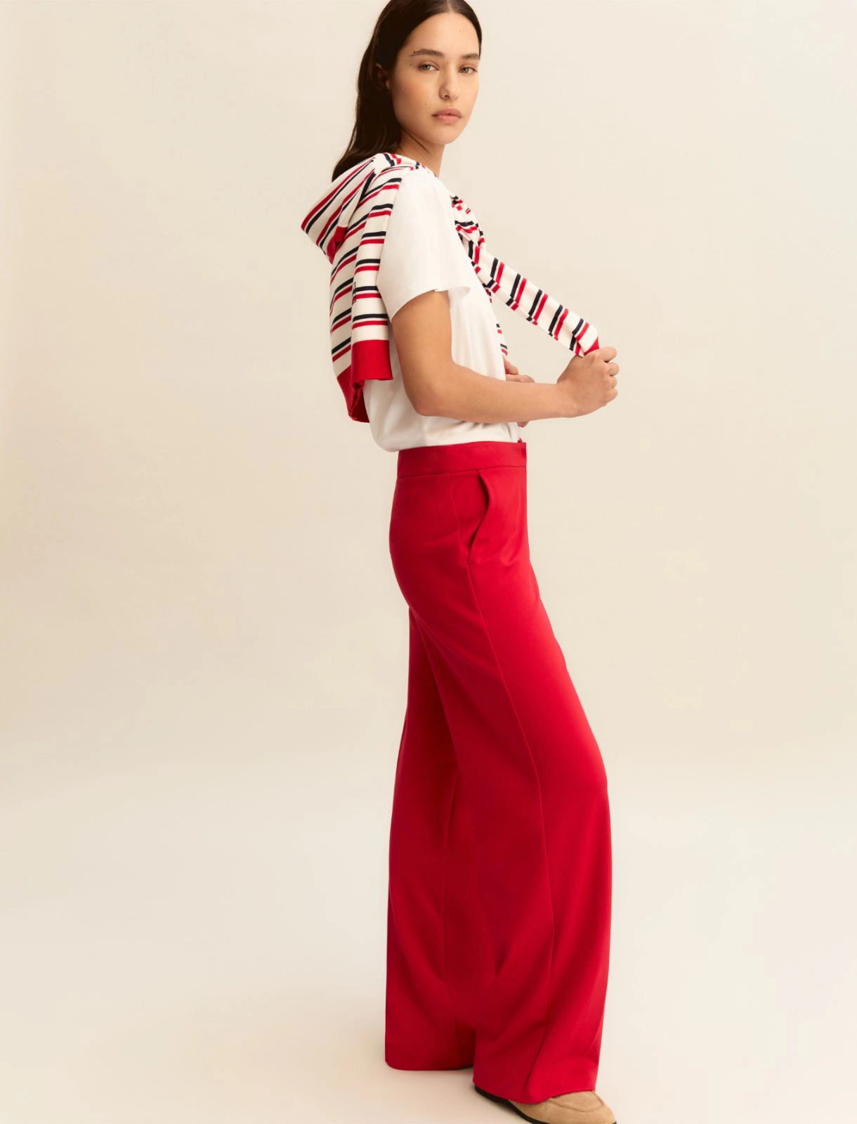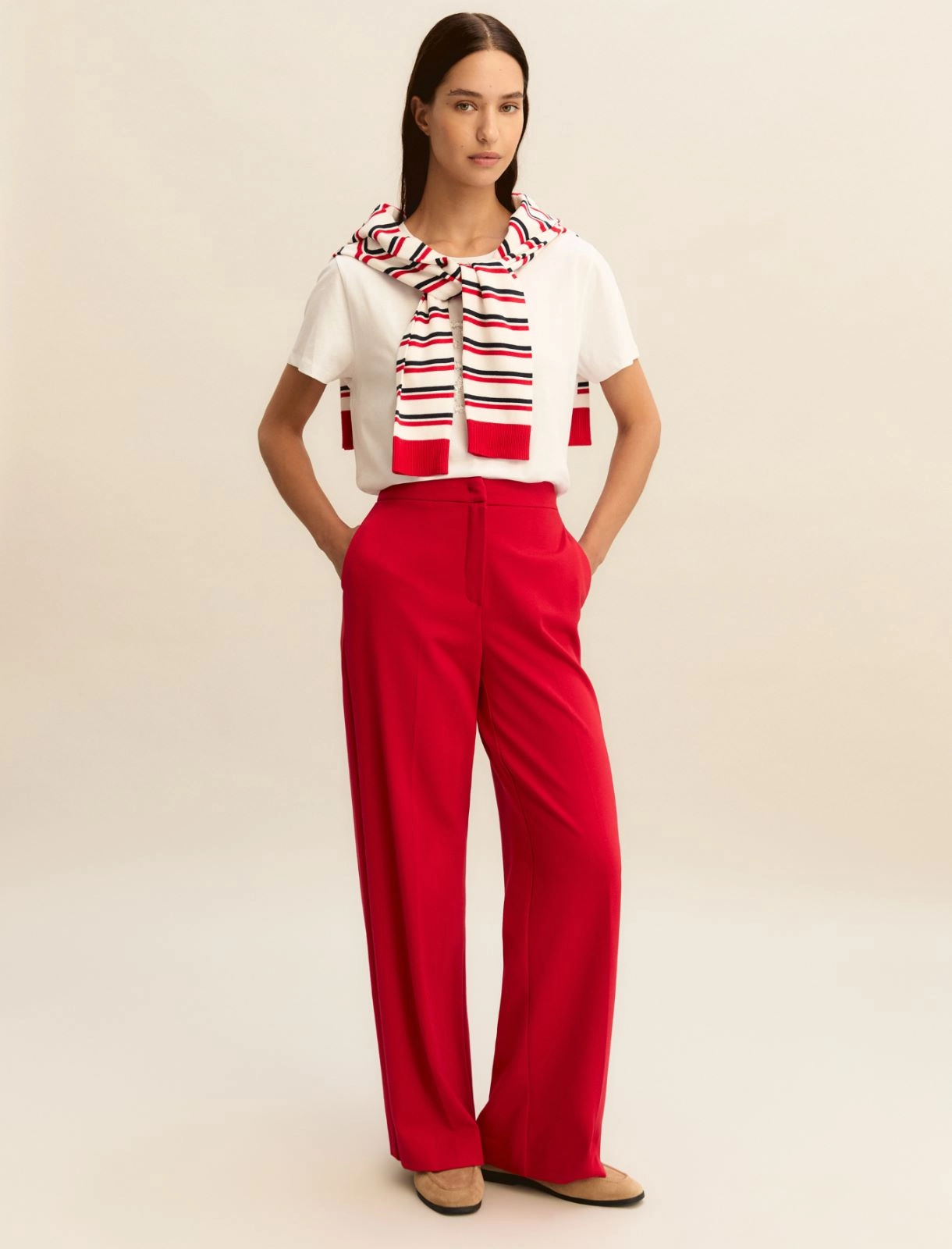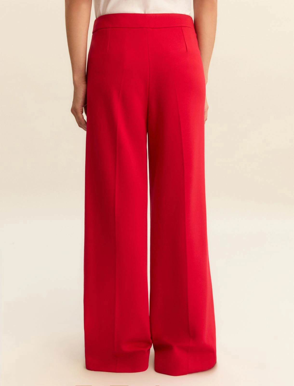 Pantalón de punto elástico de mezcla de viscosa. Corte amplio y cierre con botón a presión y cremallera oculta. Bolsillos franceses laterales. Raya marcada en la parte delantera y trasera.