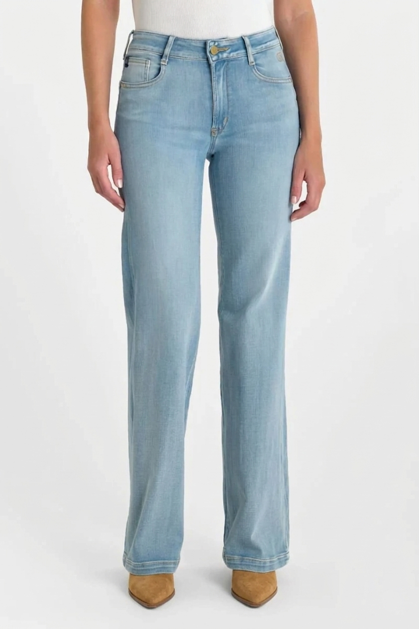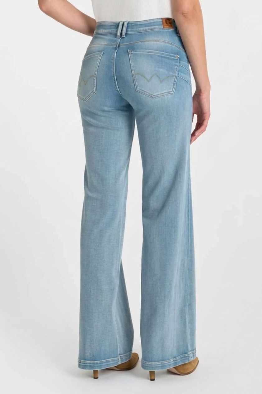 Vaquero talle alto y corte acampanado desde la mitad del muslo. Tejido elástico.