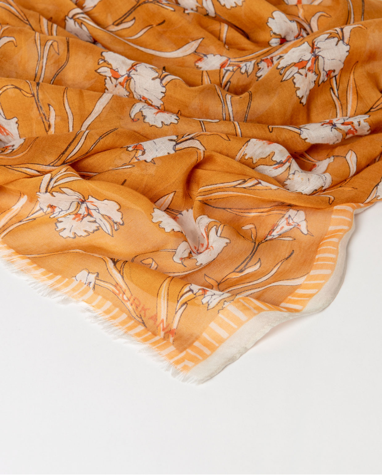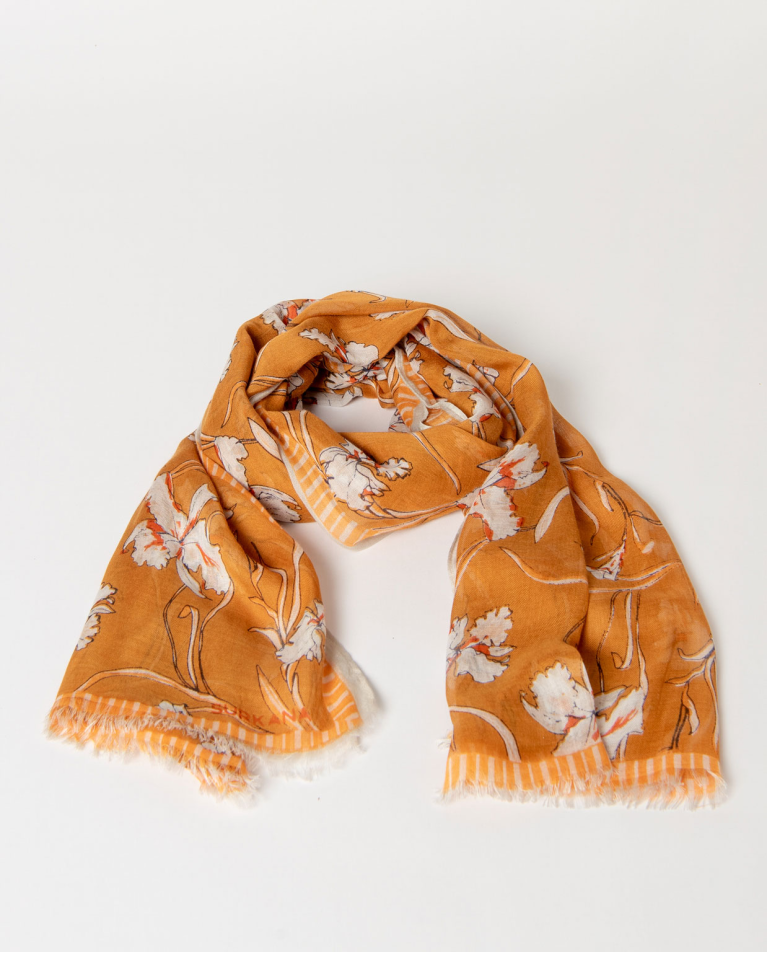 Pañuelo rectangular confeccionado en tejido ligero con estampado floral. Diseño con acabado desflecado en los extremos.