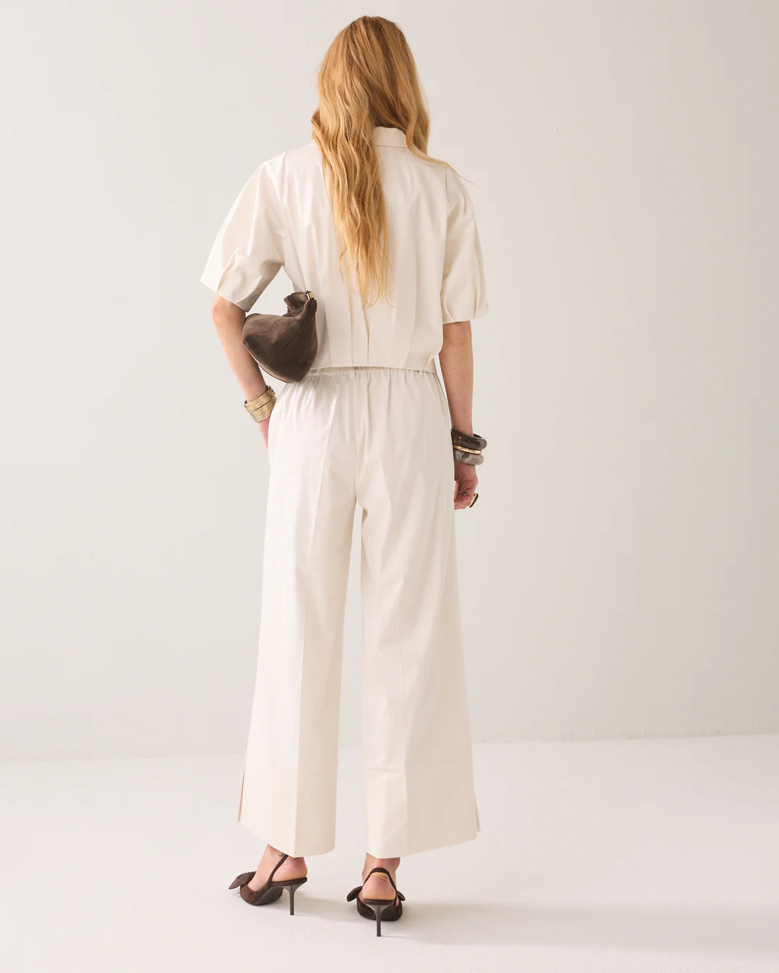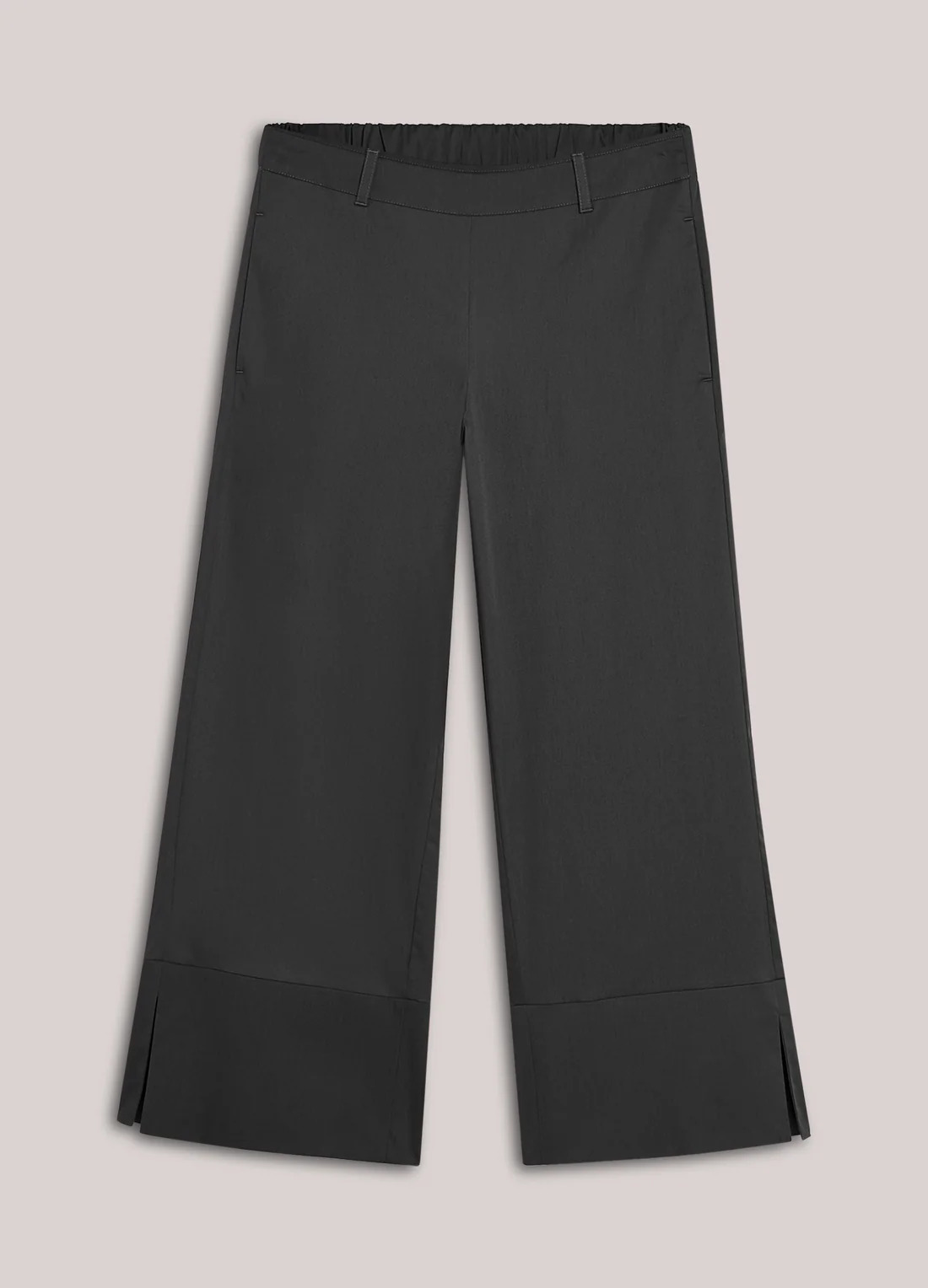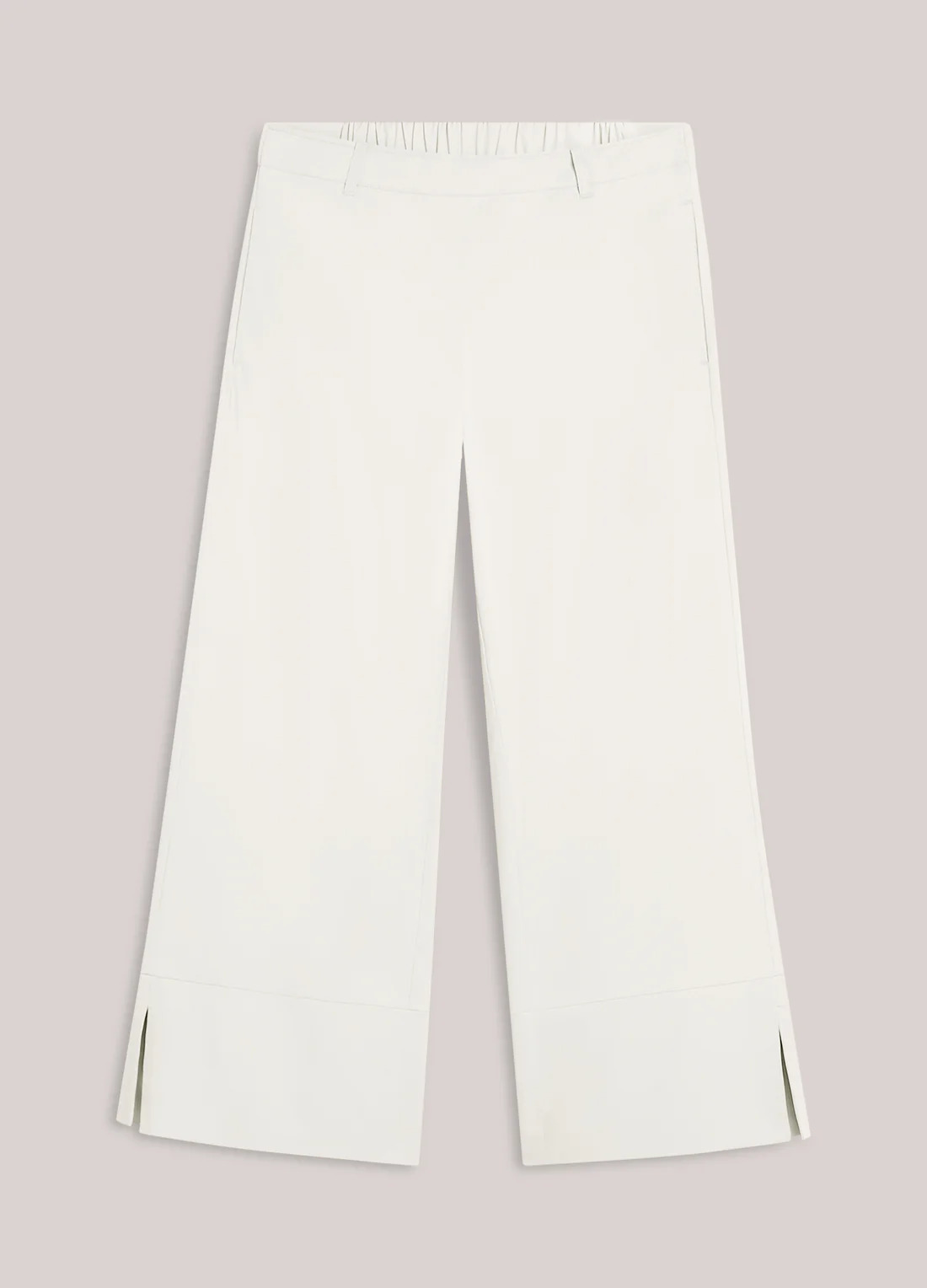 Pantalón corte recto, bajo ancho y aberturas laterales. Cintura elástica en la parte trasera y cinturilla lisa en la parte delantera.