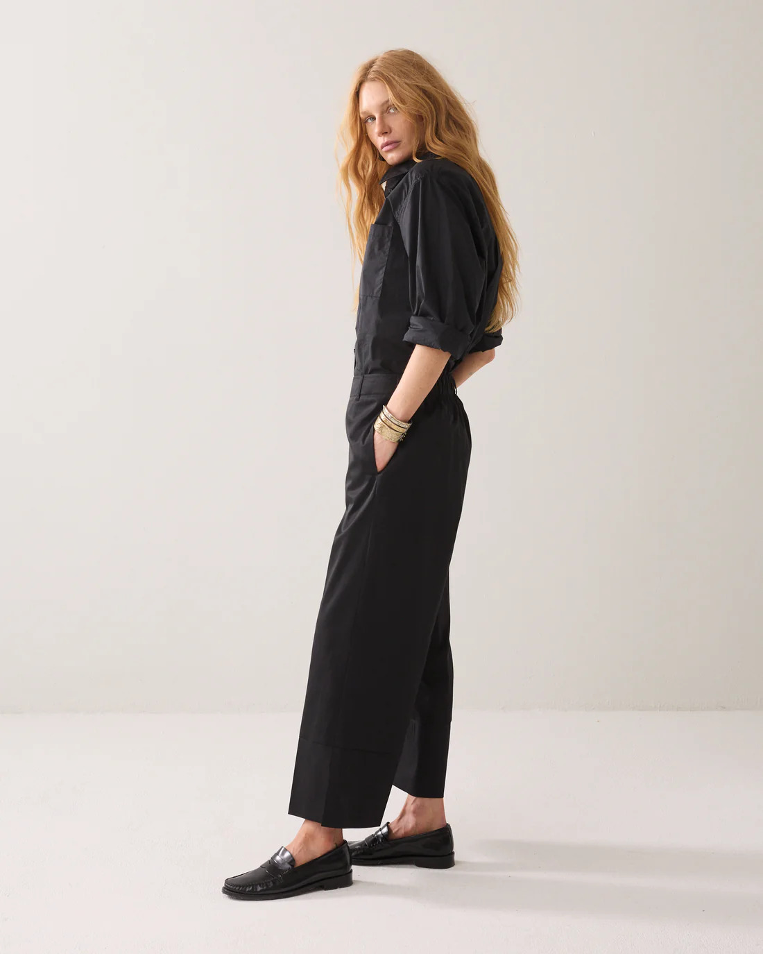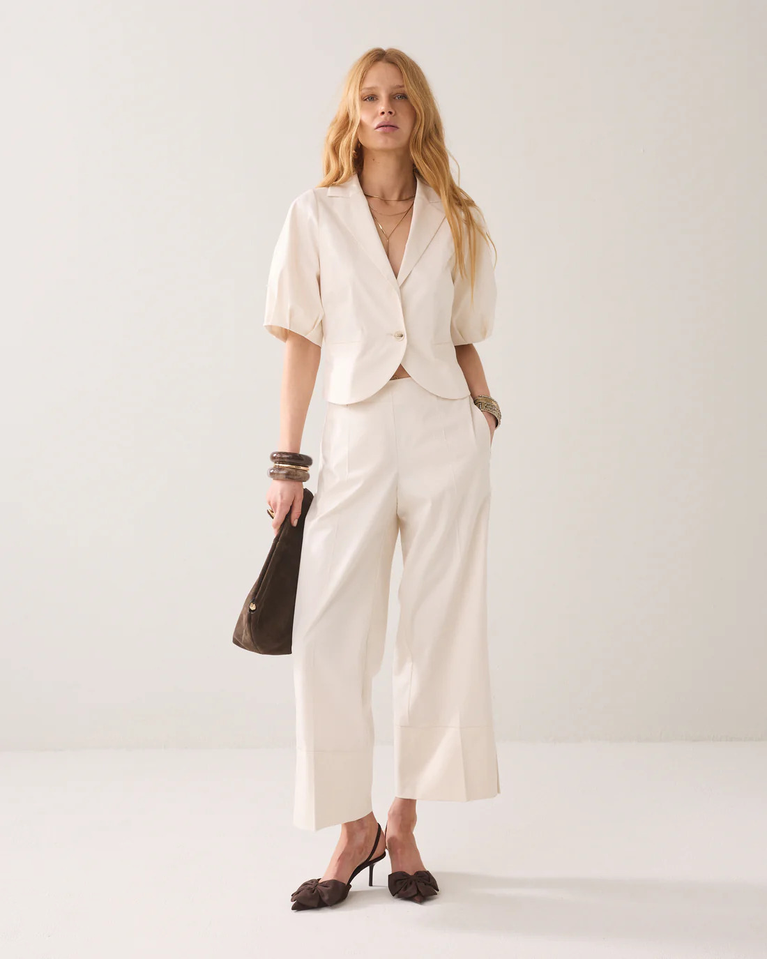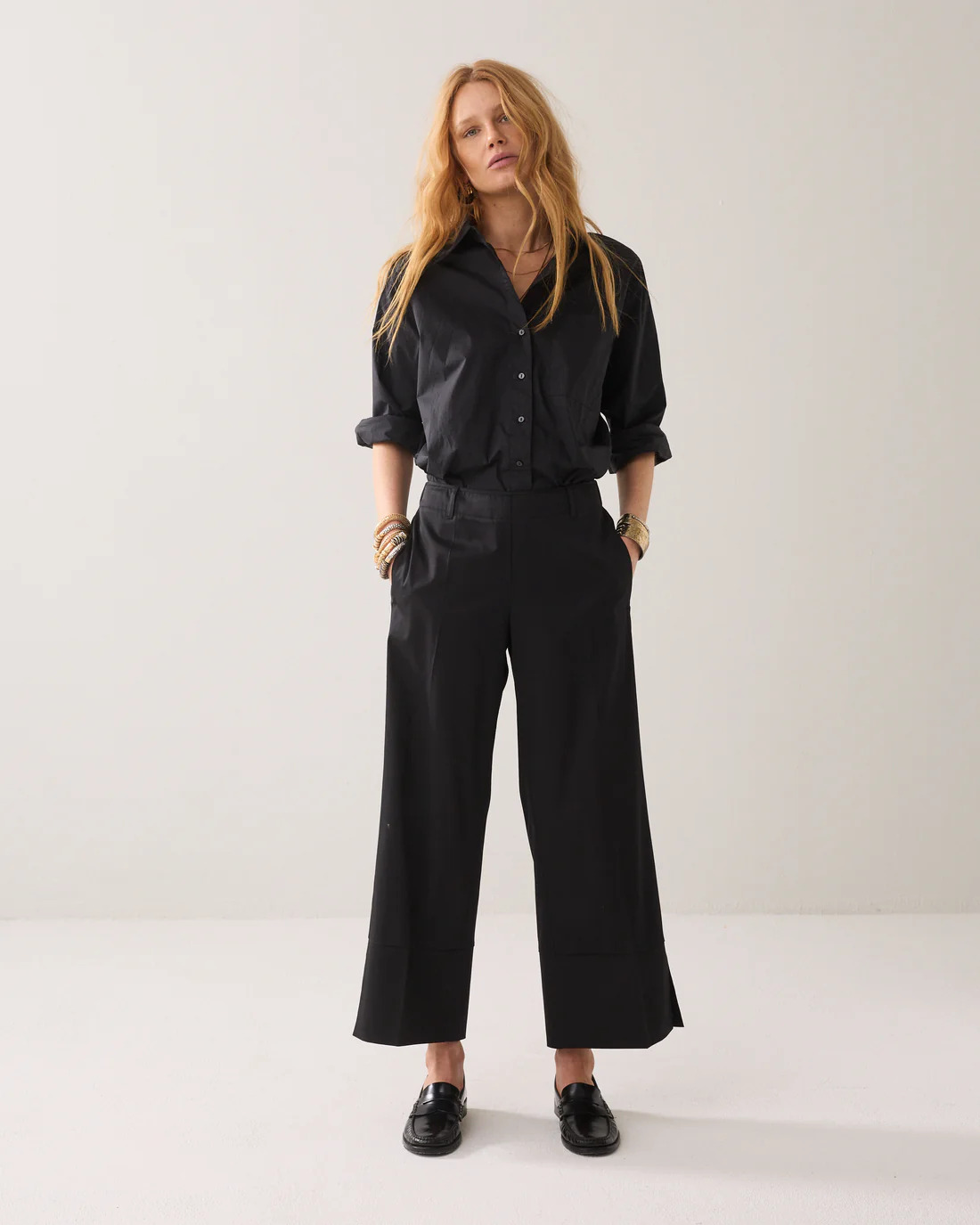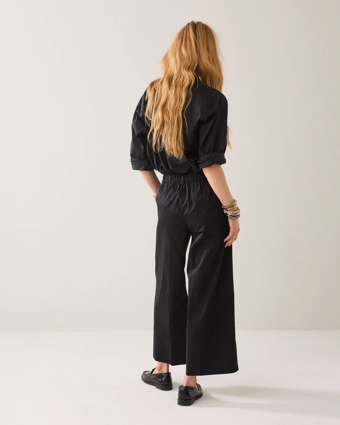 Pantalón corte recto, bajo ancho y aberturas laterales. Cintura elástica en la parte trasera y cinturilla lisa en la parte delantera.