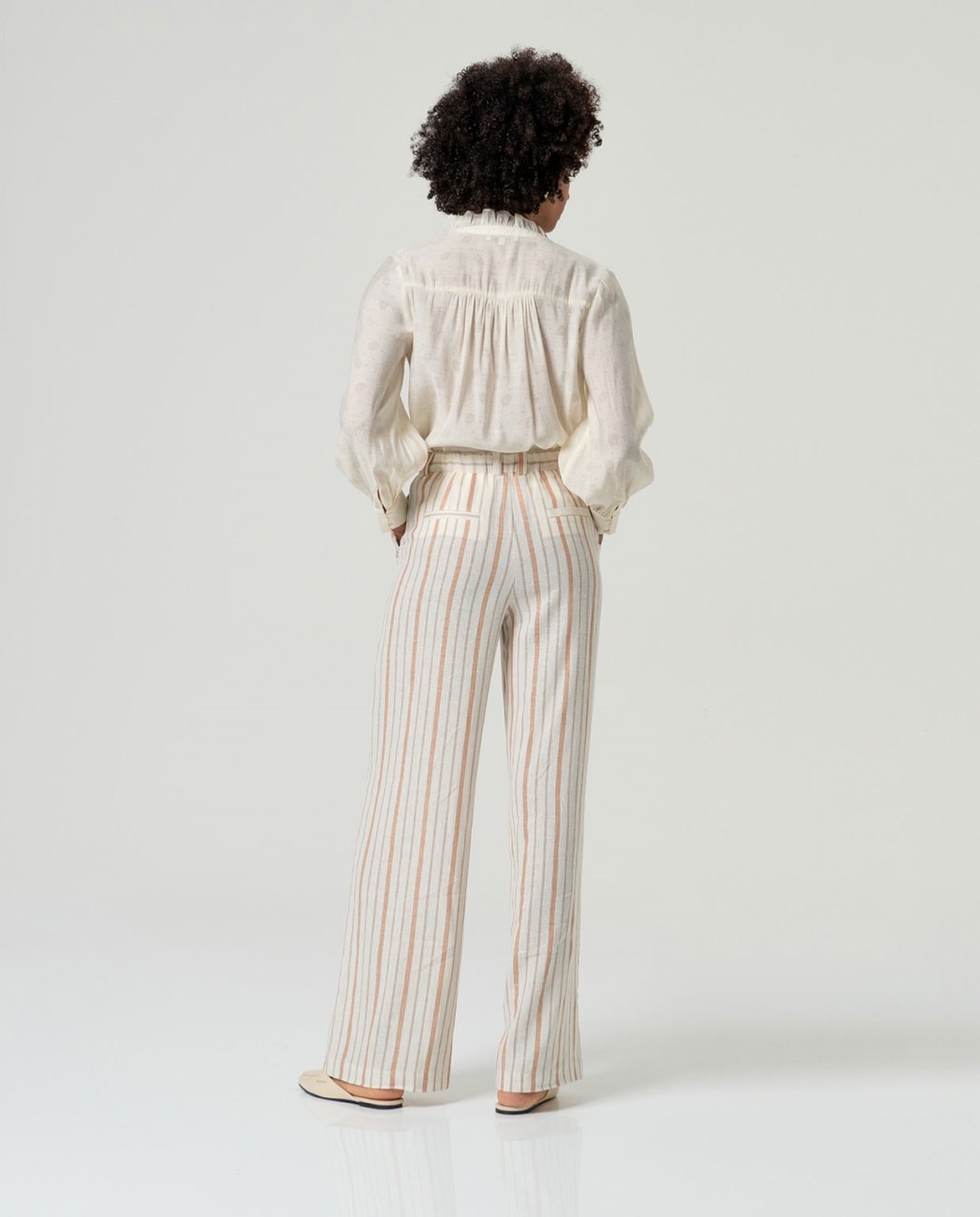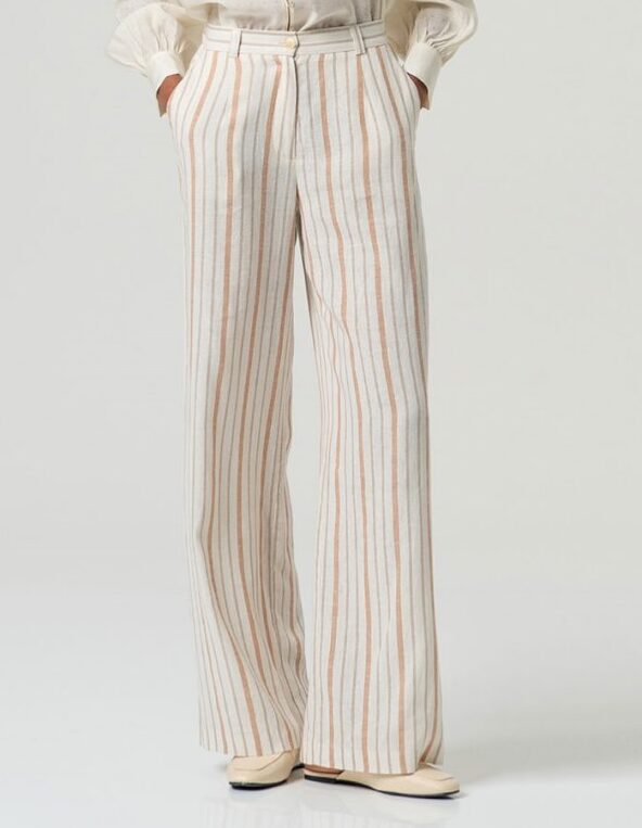 Pantalón de tiro alto con pernera ancha y recta. Bolsillos delanteros de vivo y cierre frontal con cremallera y botón. Confeccionado en mezcla de lino y algodón.