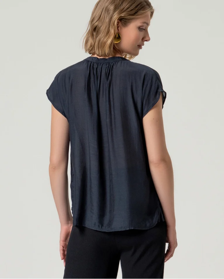 Camisa de manga corta con cuello camisero y cierre frontal de botones. Diseño recto con bordados en contraste y bajo ligeramente redondeado. Confeccionada en tejido con cupro y modal.