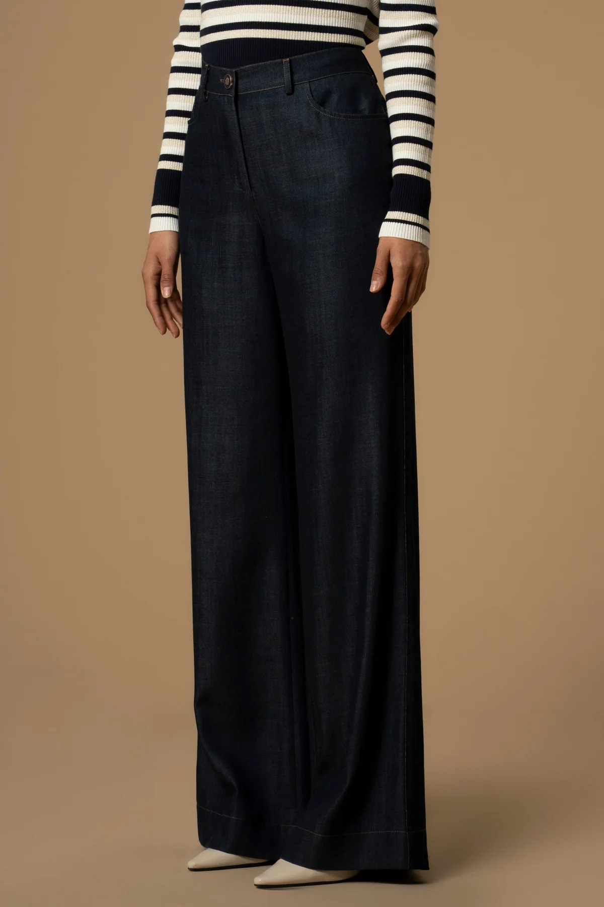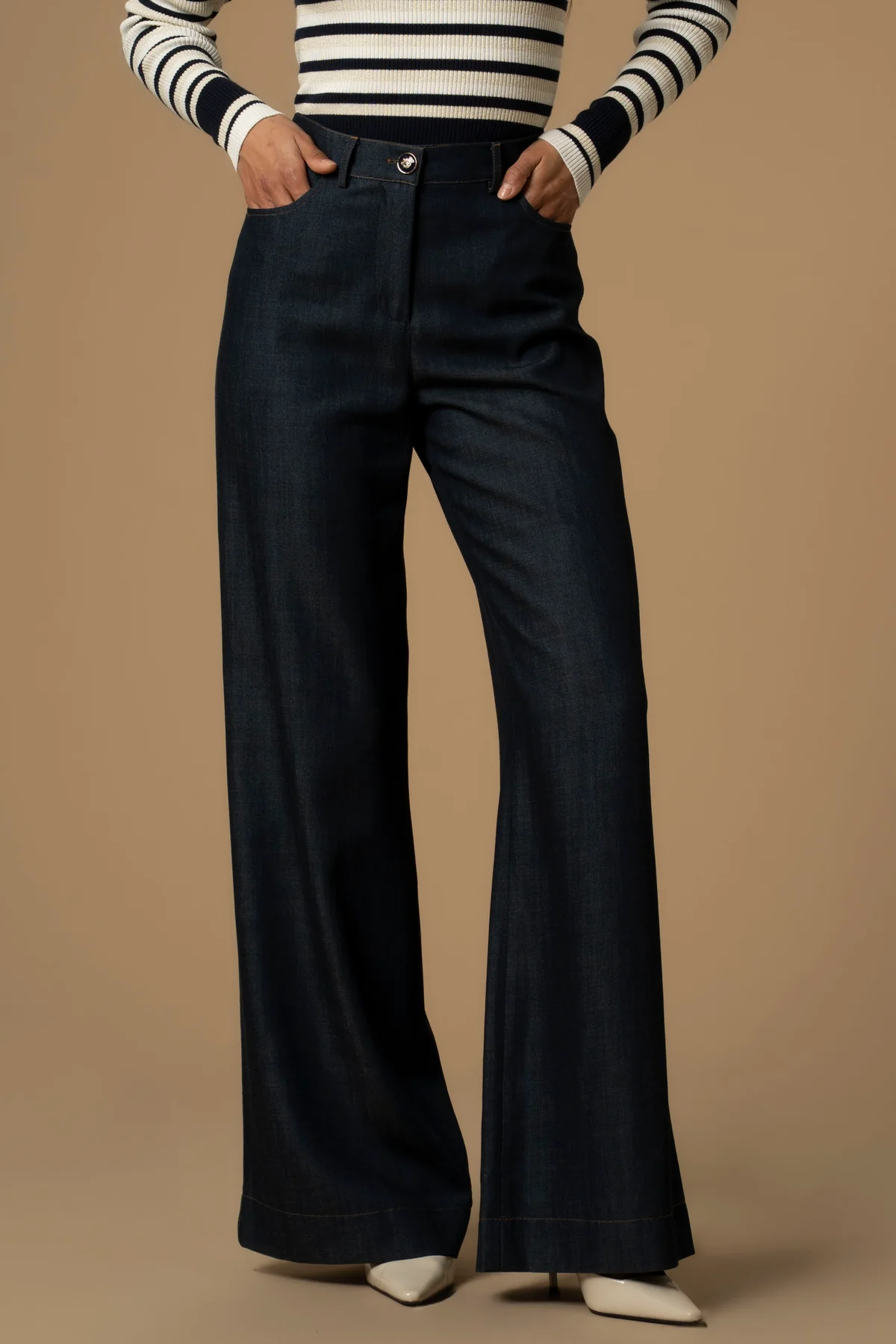 Pantalón de tiro alto con pernera larga y ancha. Cierre frontal de cremallera y botón, perfectas para estilizar la figura con elegancia.