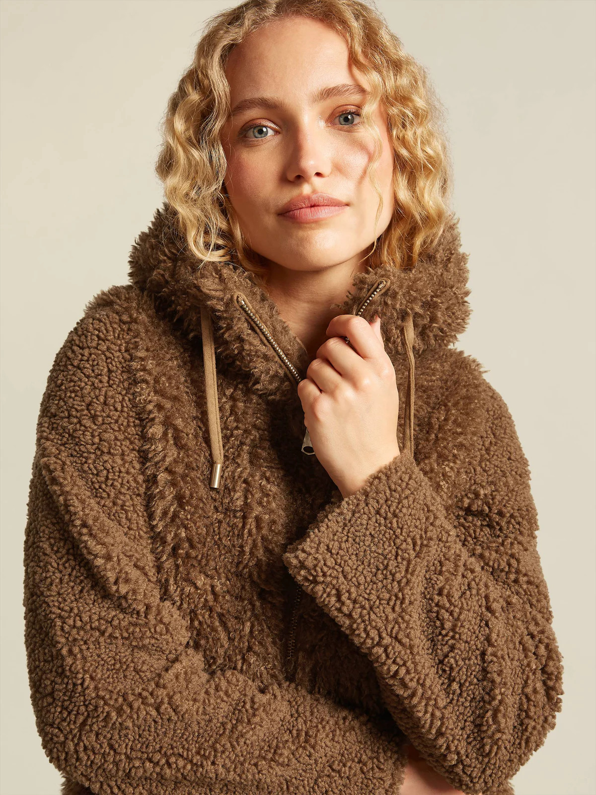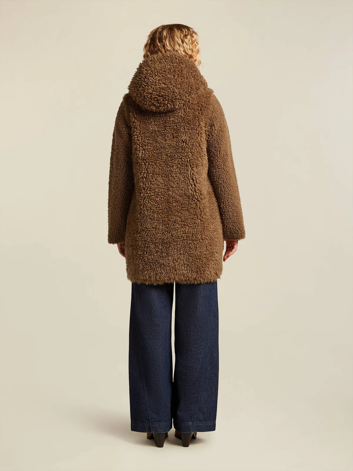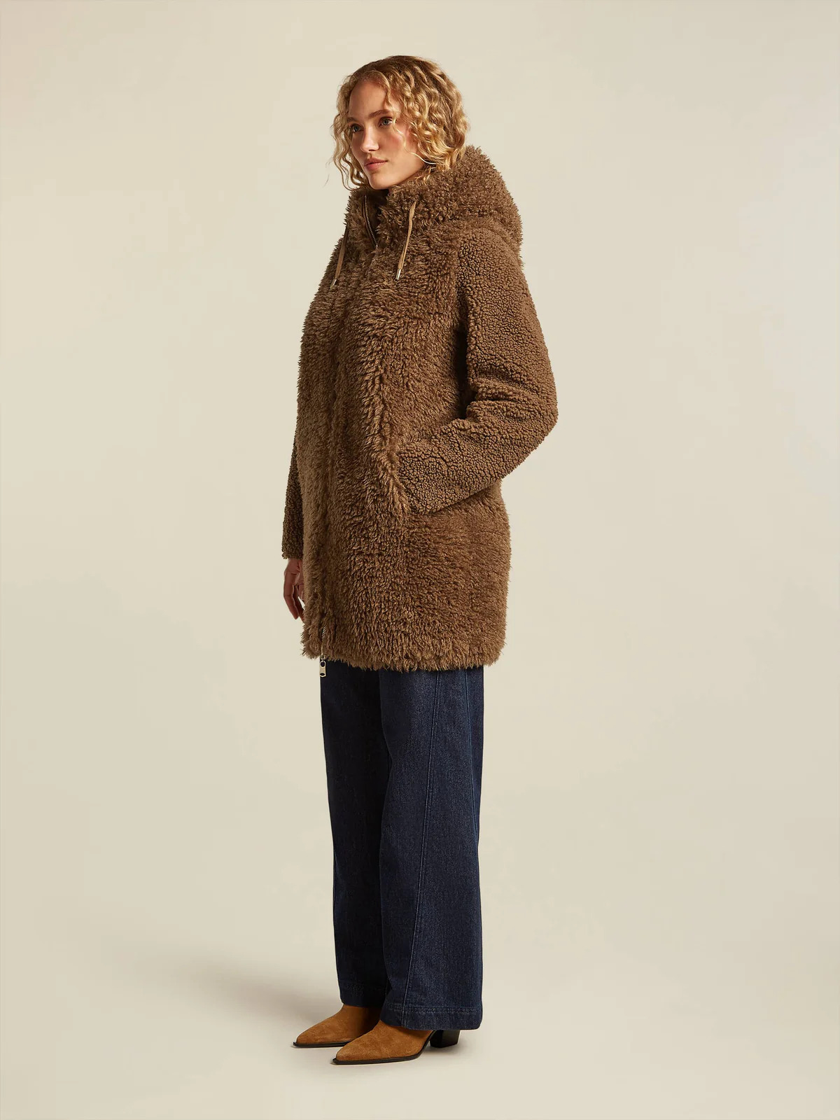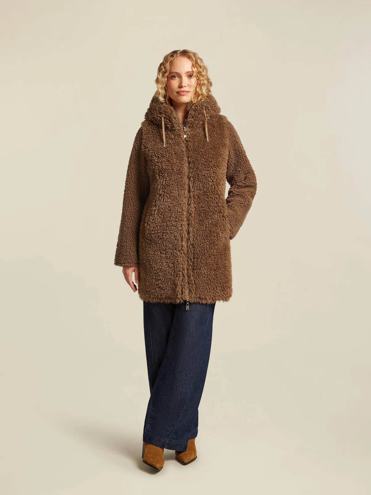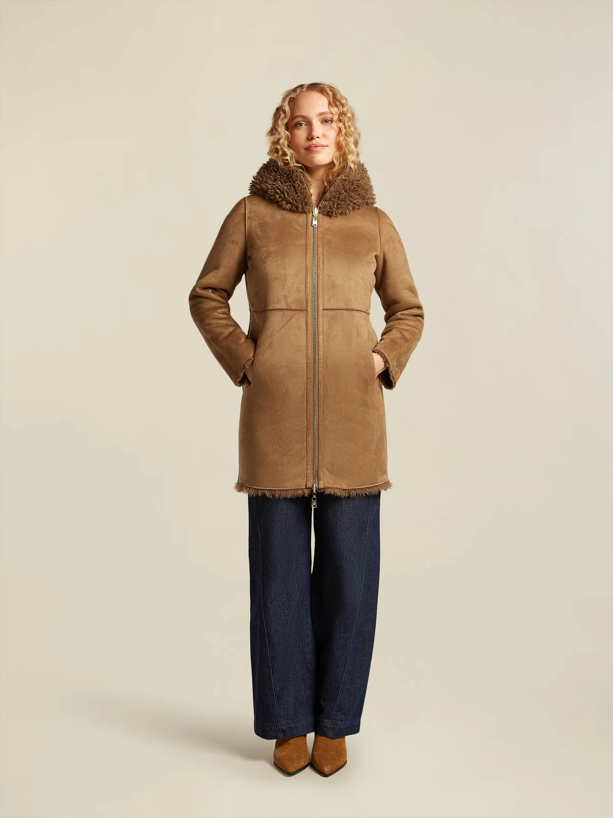 Abrigo reversible de piel sintética reciclada. Confeccionado con ante sintético, sin forro. Cierre frontal con cremallera bidireccional. Bolsillos laterales en las costuras y capucha ajustable con cordón.