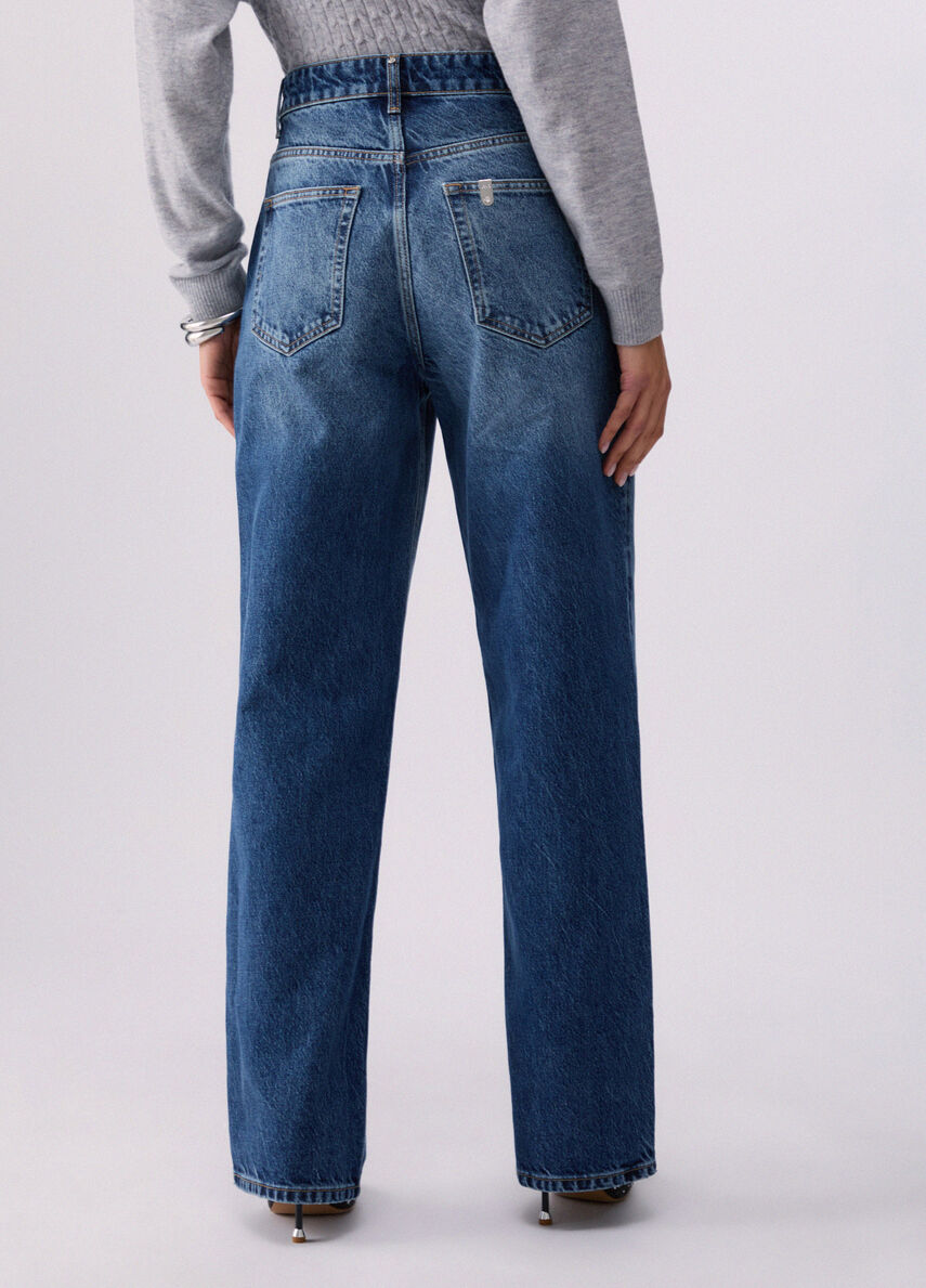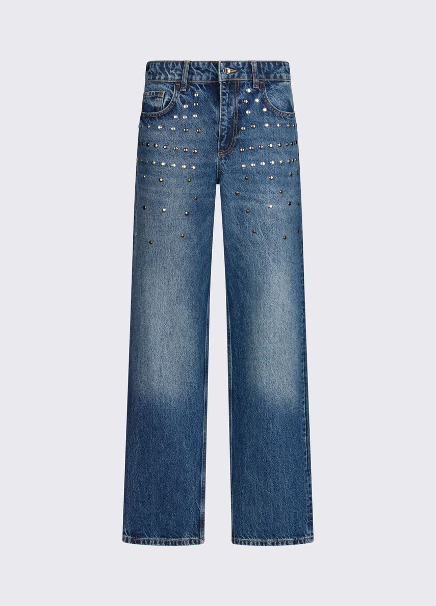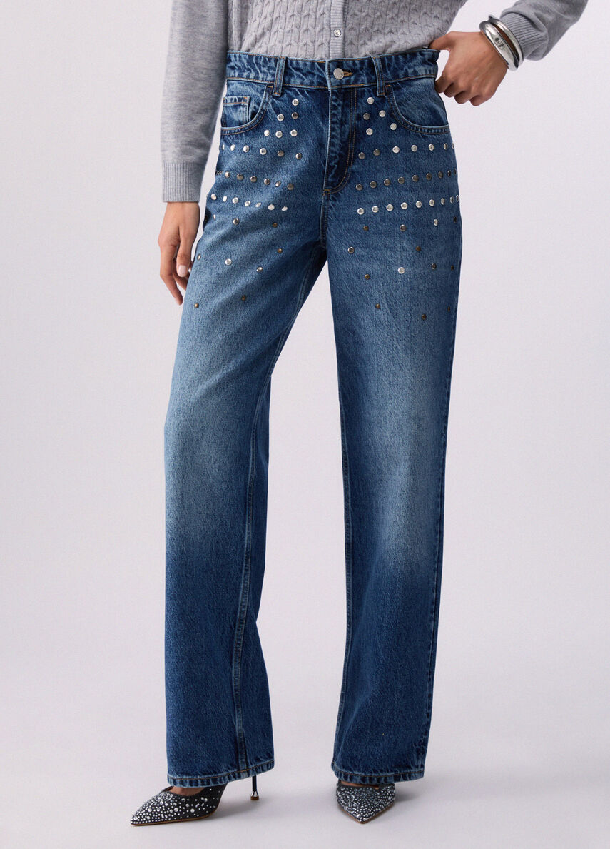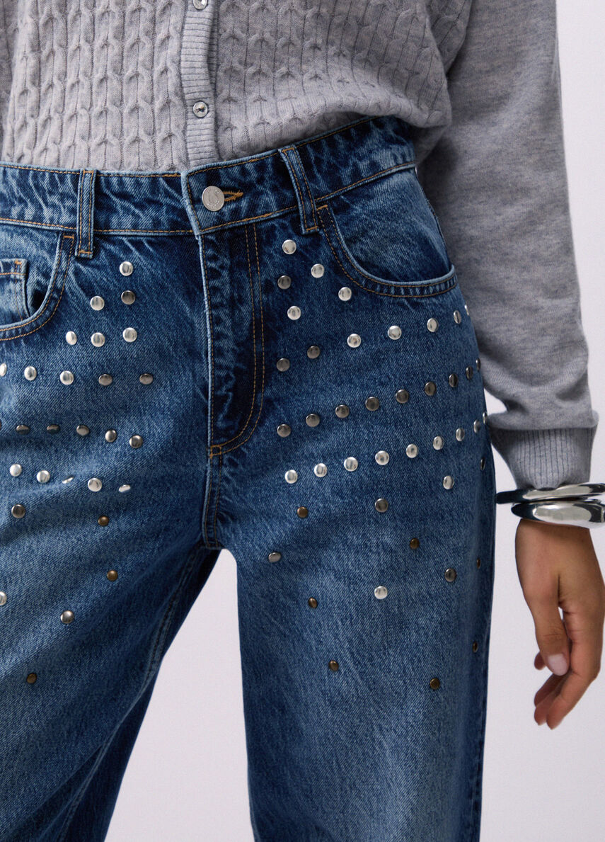 Jeans de mezclilla de algodón. Lavado usado. Cintura regular. Pierna suave y bolsillos cómodos. Tachuelas aplicadas y cierre de cremallera y botón.