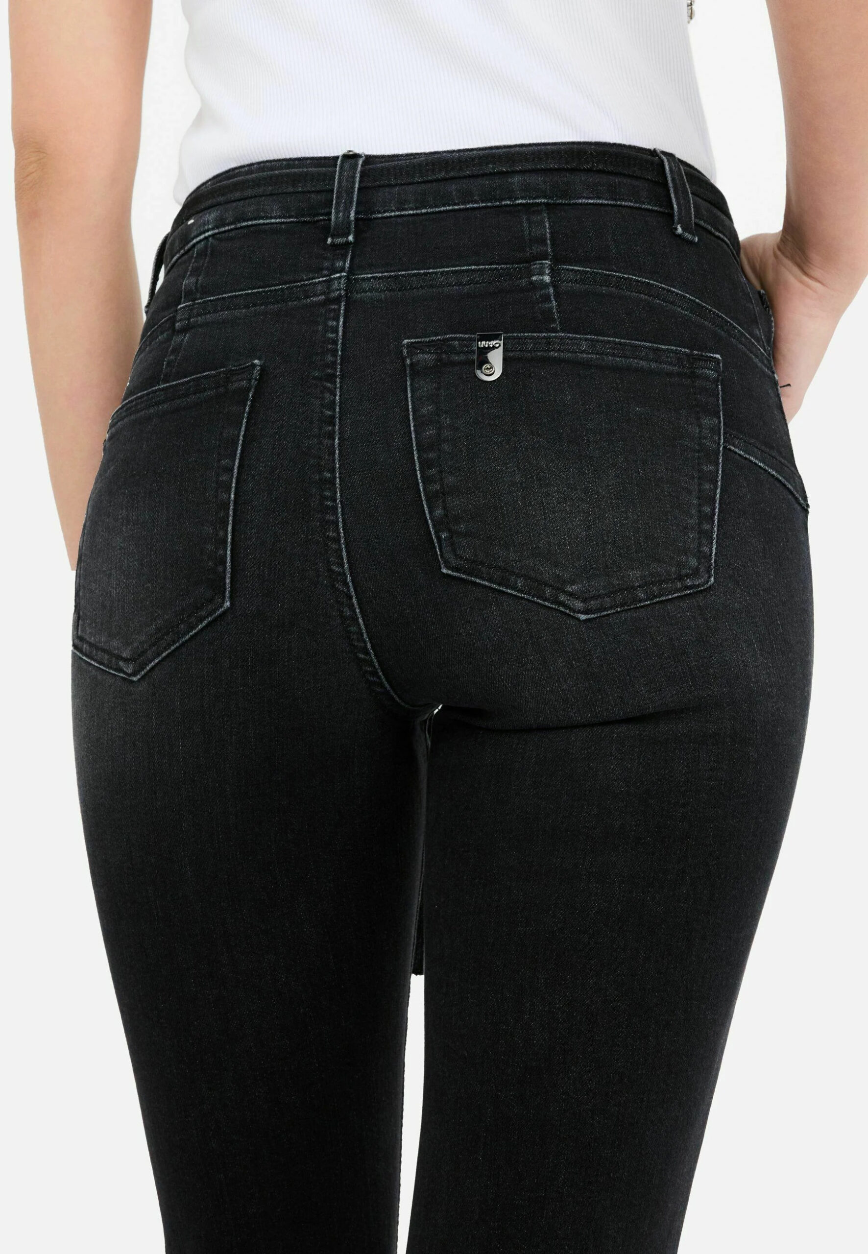 Vaqueros de algodón elástico. Talle alto, pernera acampanada y cinturón con hebilla con logotipo.